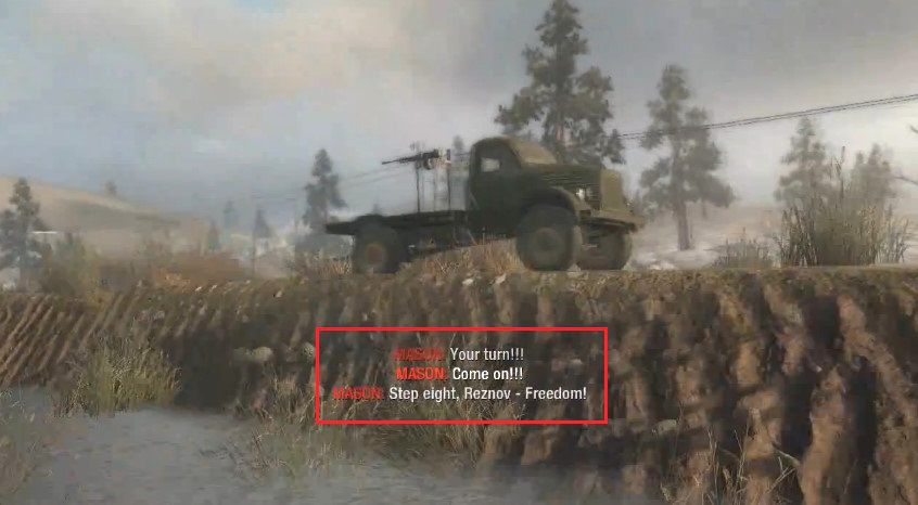 Mason accomplishes “Step 8: Freedom” by driving out of the Vorkuta camp using a motorbike. Unfortunately, Reznov does not make it.