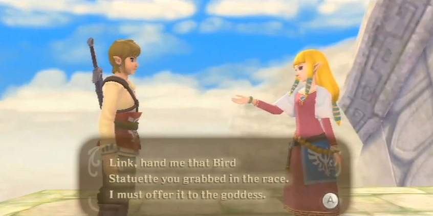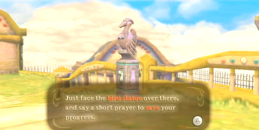 To even do something basic like save your progress, you must offer prayers to the goddess Hylia. This is done by saying prayers at bird statues located throughout the world of Skyward Sword. The player is taught to do this near the beginning of the game.