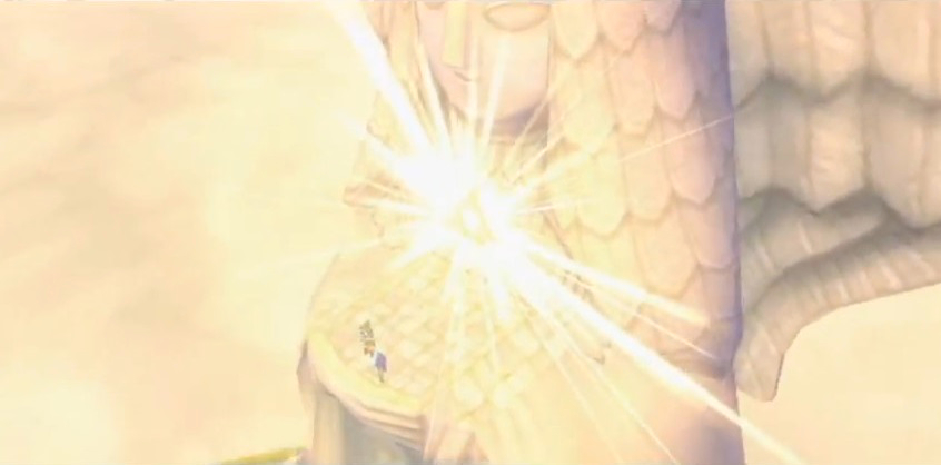 After Link prays, the golden triangles of the Triforce come together and glow with a blinding light. The island Link was on then falls down through the cloud barrier of Skyloft to the Surface.
