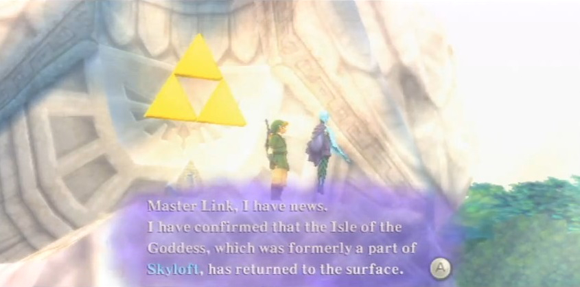 “Master Link, I have news. I have confirmed that the Isle of the Goddess, which was formerly a part of Skyloft, has returned to the surface. Furthermore, I have detected the successful eradication of Demise. Your prayers to the Triforce have been heard.