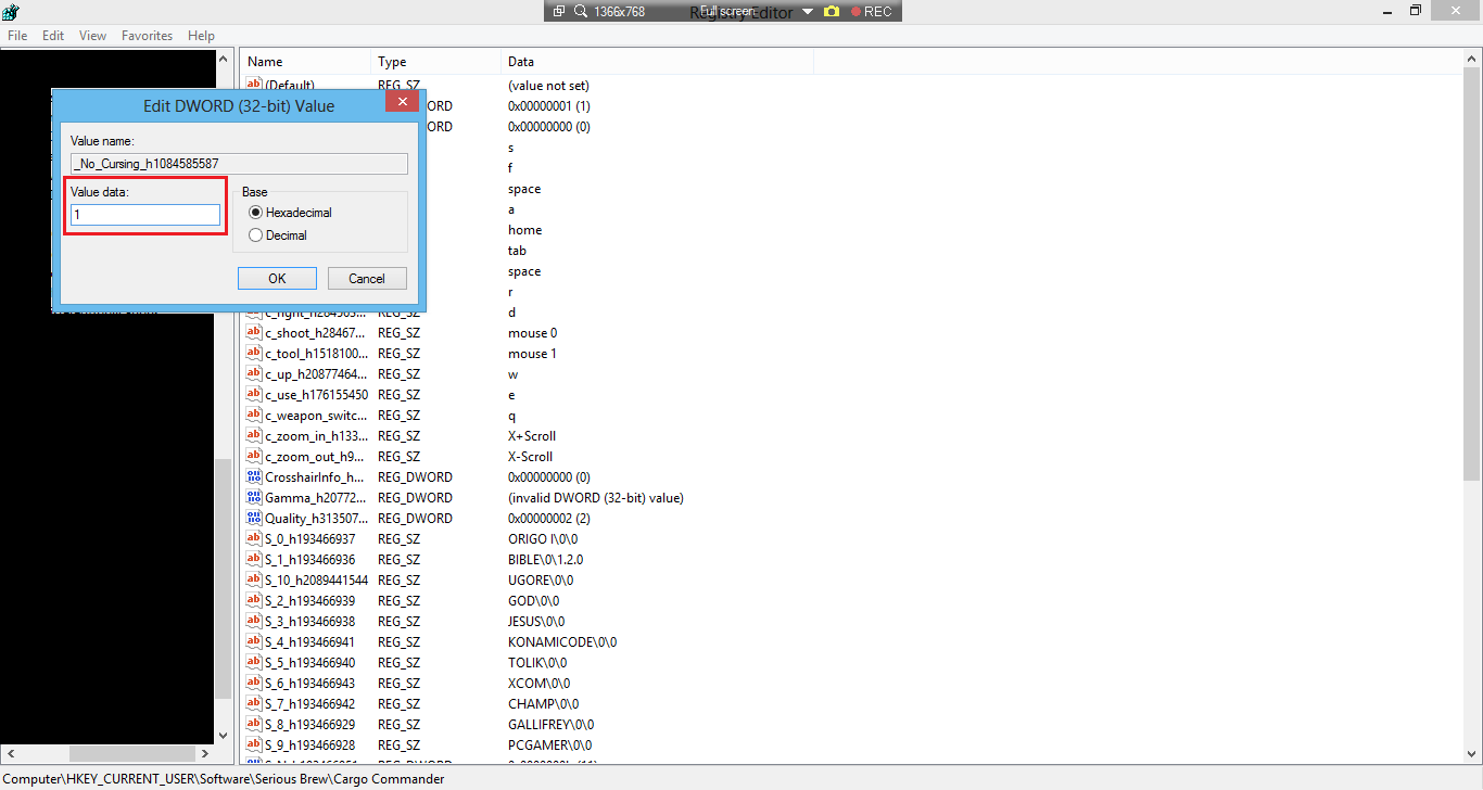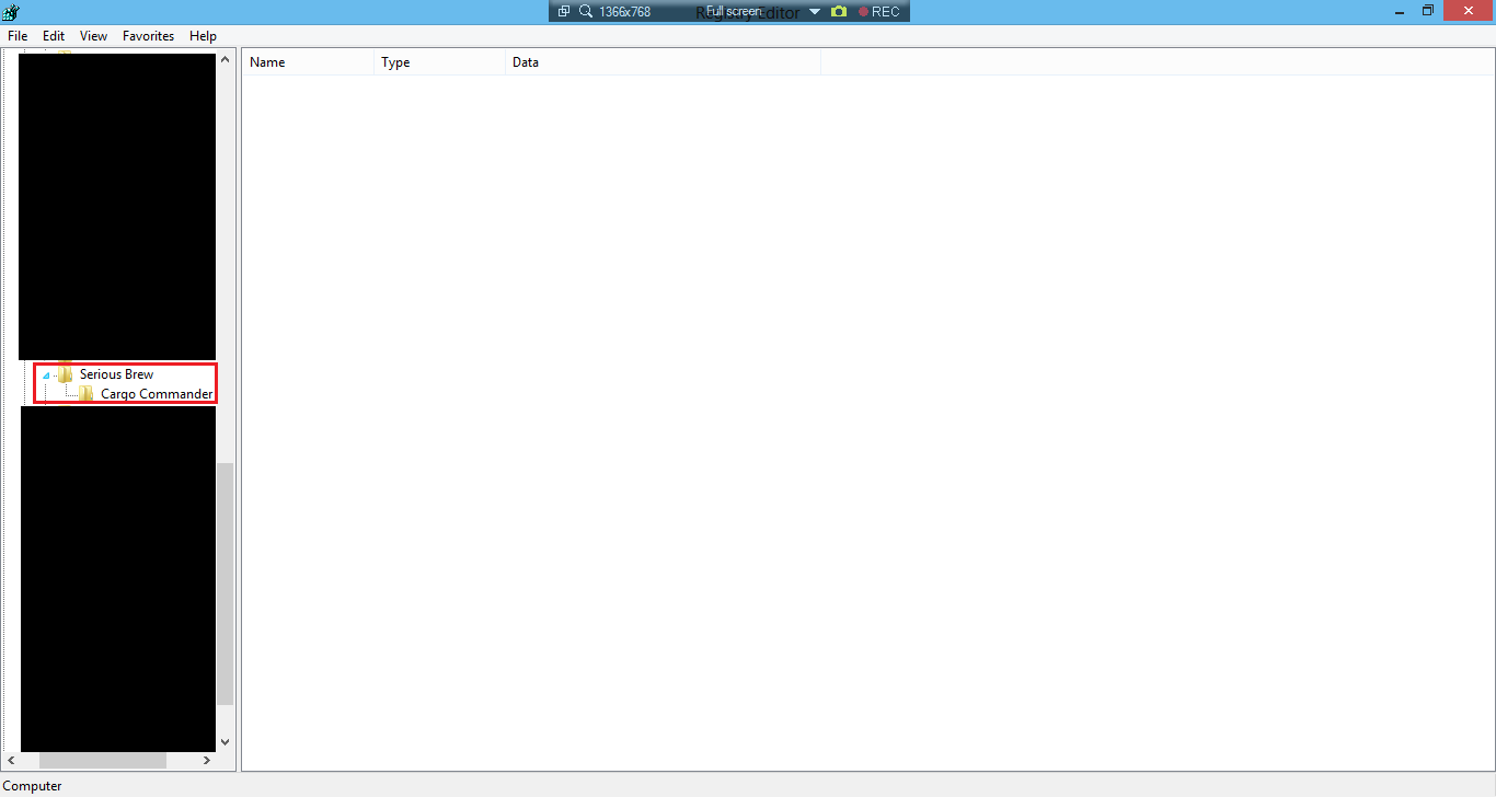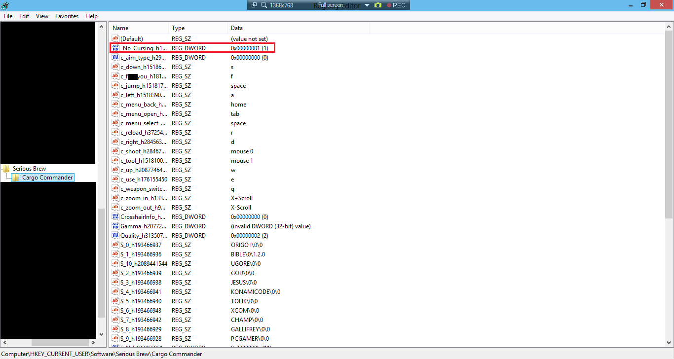 …and you should arrive at this screen. This is the registry editor, and it will allow us to disable the player’s profanity in Cargo Commander.
