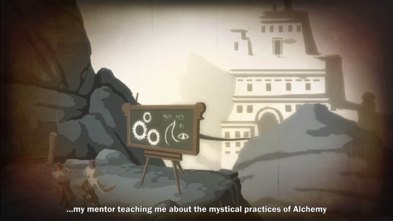 In the beginning of the second chapter we learn about the Old Inventor’s youth in a monastery. His monk mentor teaches him the ways of alchemy and science alike, and he later uses these techniques to enchant the Vapor and create a new energy source.