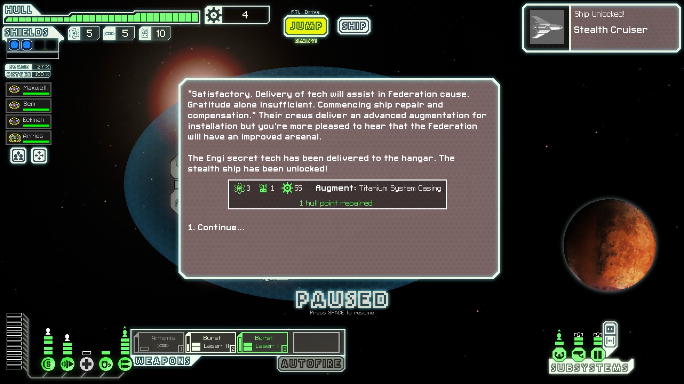 Your choices determine how events unfold and may result in rewards or permanent damage to your ship/crew. In the example below, your actions earn the Stealth Cruiser vessel for use in future playthroughs.