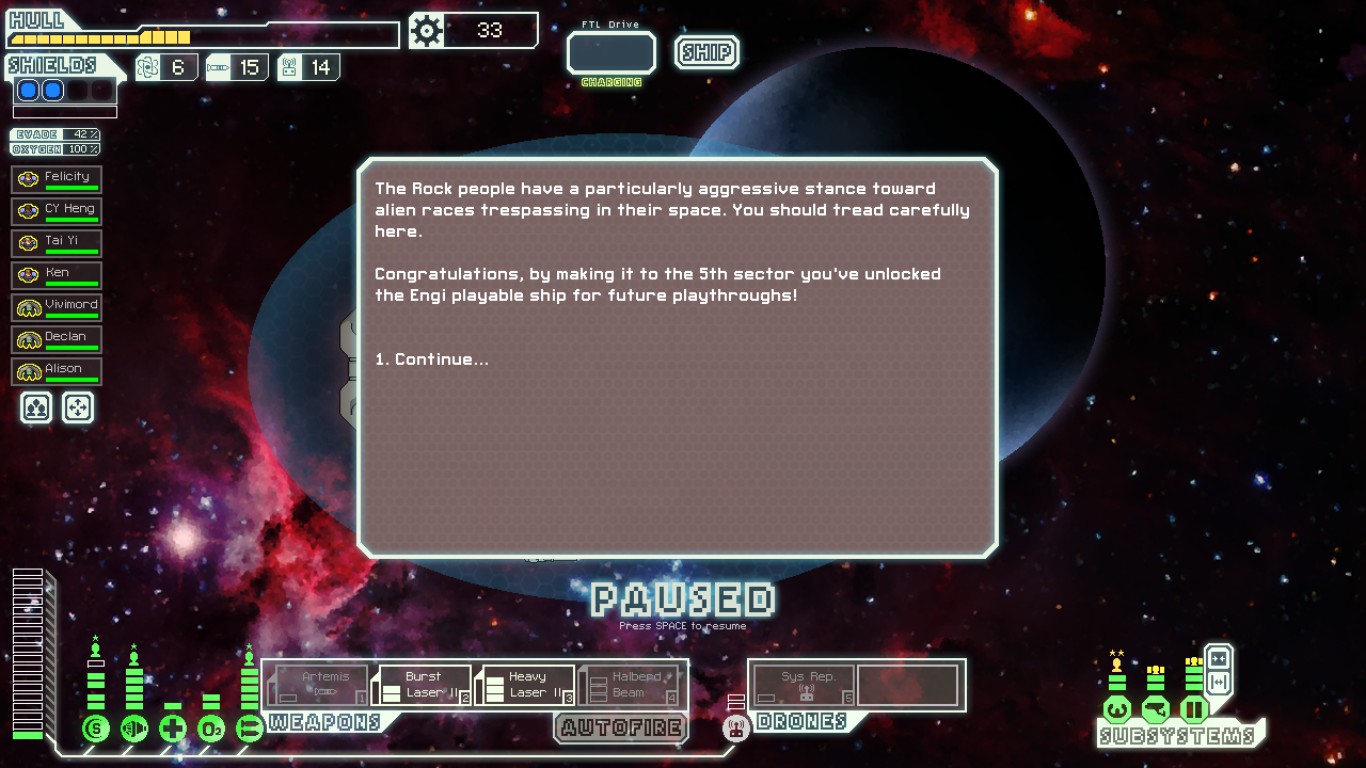 Since FTL: Faster than Light is a roguelike, death at any point is permanent.