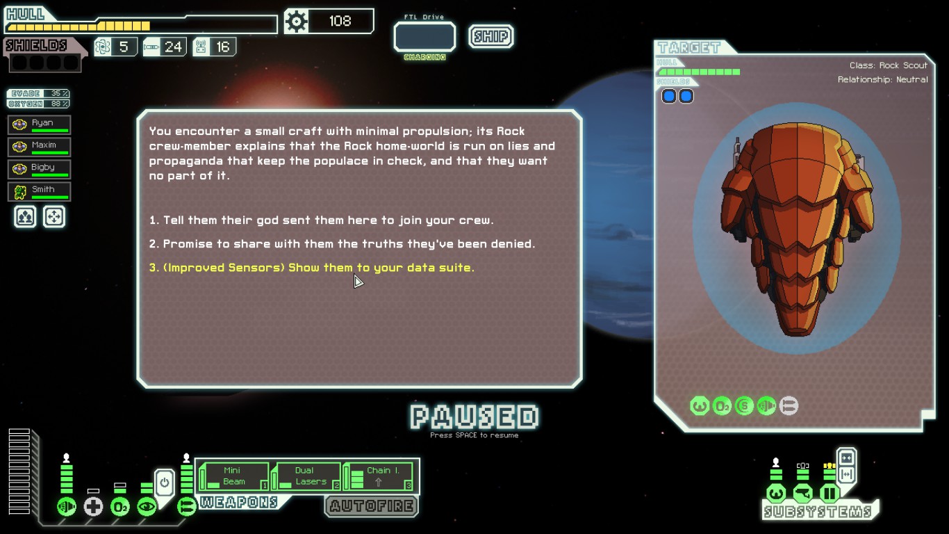 “You encounter a small craft with minimal propulsion; its Rock crew-member explains that the Rock home-world is run on lies and propaganda that keep the populace in check, and that they want no part of it.“