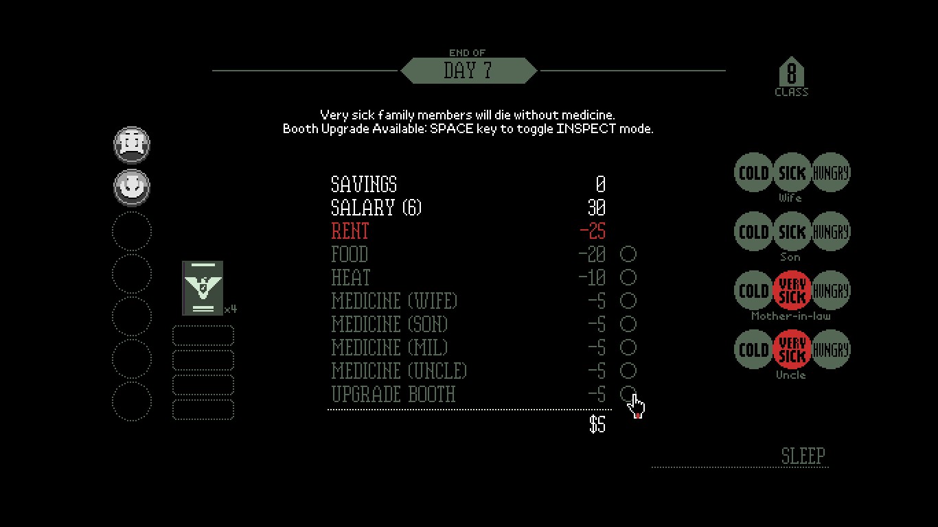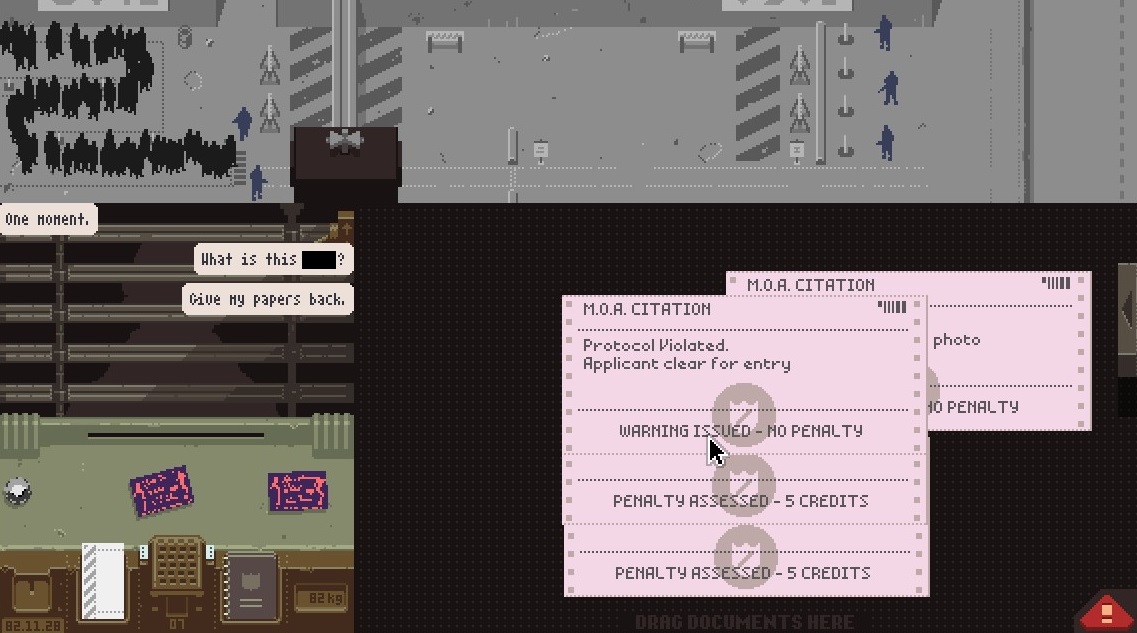 During each in-game day, you must process immigrants as quickly and accurately as you can to ensure the survival of your family. Operational errors and taking bribes can result in fines (or worse), meaning you may not be able to pay for food, medicine or heat.