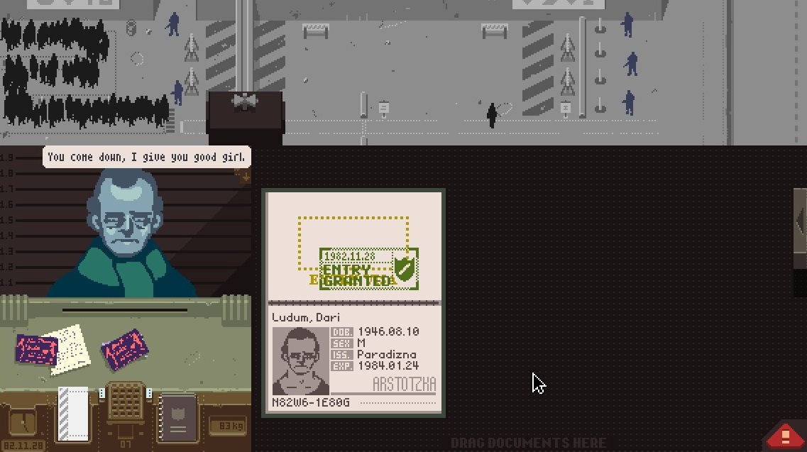 One day, a legitimate immigrant worker arrives at the Arstotzkan checkpoint–bearing a Pink Vice brothel business card…