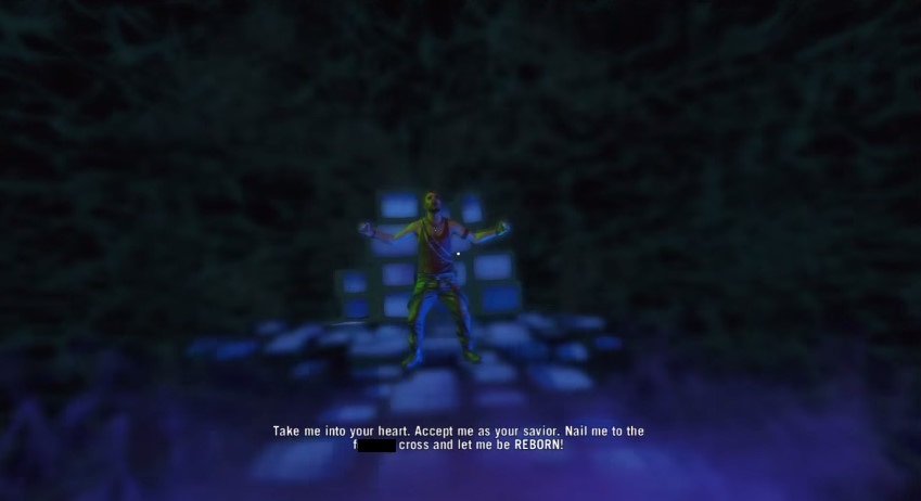 Vaas (with outstretched arms) asks the player character to “Accept me as your savior.