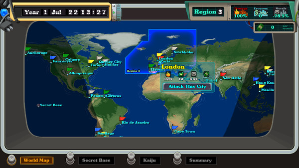 Gameplay in Kaiju-a-GoGo consists of tearing apart buildings and historical monuments, stomping on civilians, and fighting the Kaiju Defense Force (KDF) in locations around the globe. Resources gained from battle/surrendered cities are used to upgrade your secret island base and Kaiju. Each Kaiju has 90+ unique abilities, so playthroughs can be wildly different depending on the player.
