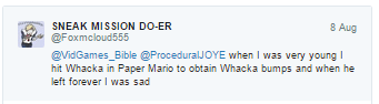 “When I was very young I hit Whacka in Paper Mario to obtain Whacka bumps and when he left forever I was sad”