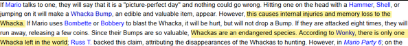 “Hitting one on the head…will make a Whacka Bump, an edible and valuable item, appear. However, this causes internal injuries and memory loss to the Whacka…Whackas are an endangered species. According to Wonky, there is only one Whacka left in the world. Russ T. backed this claim, attributing the disappearances of the Whackas to hunting.”